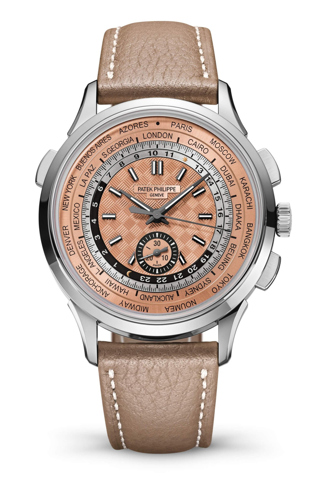 世界时间加上飞返计时虽然复杂,但表盘的颜色分配得好,整体设计反显得清新而不失层次。最难得是Ref. 5935A采用不锈钢表壳,表盘中央还带有类似碳纤维的方格装馀,复古得来还富现代的运动气息。