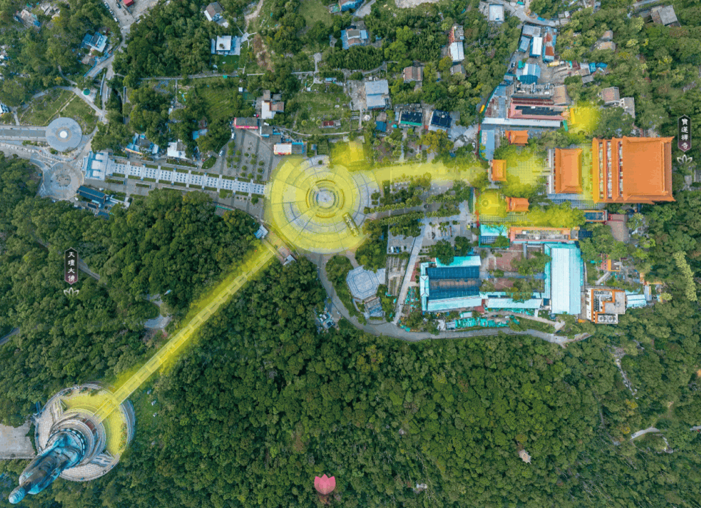 ▲黄色标示的宝莲禅寺、天坛大佛、大佛公园位置为荷花展示范围。