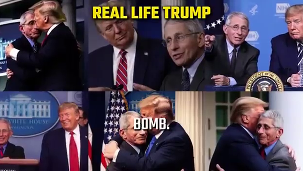 这段44秒长的影片包含特朗普在记者会和采访中的真实片段,但到了25秒处,出现6张特朗普和福奇的照片,其中3张显示他们正在拥抱或亲吻。这段影片并未说明可能使用了AI。