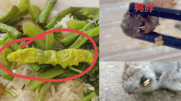 ▲高校饭堂吃出“鼠头鸭脖”和大毛虫,引发网民热议。