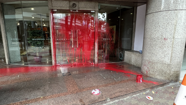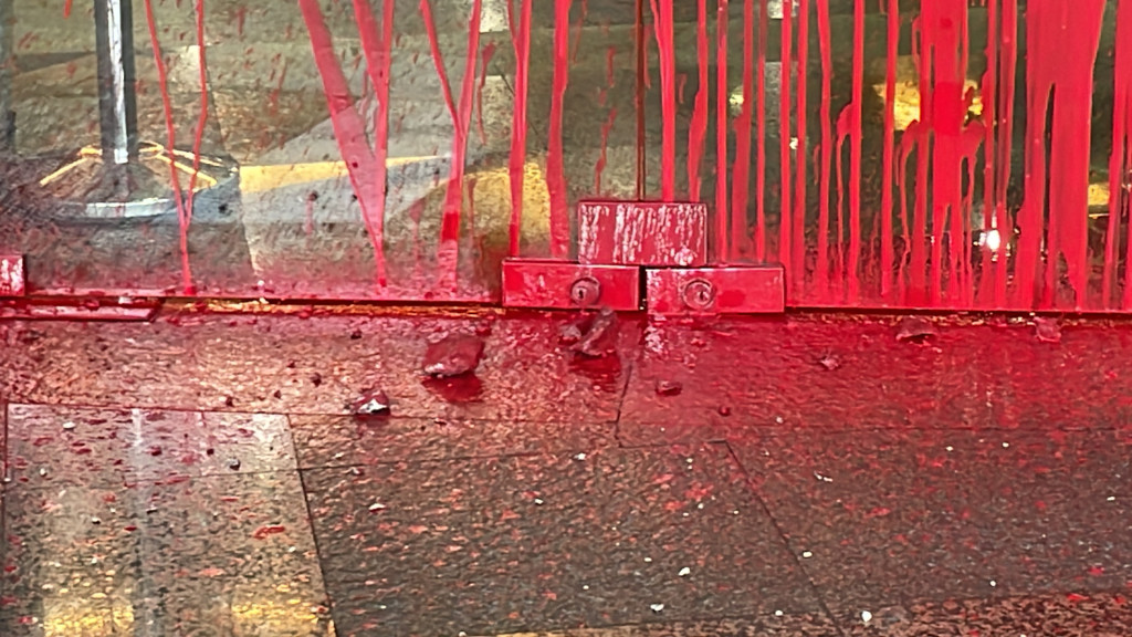▲新银集团中心大门被淋红油,比亚迪湾仔陈列室设于地铺。