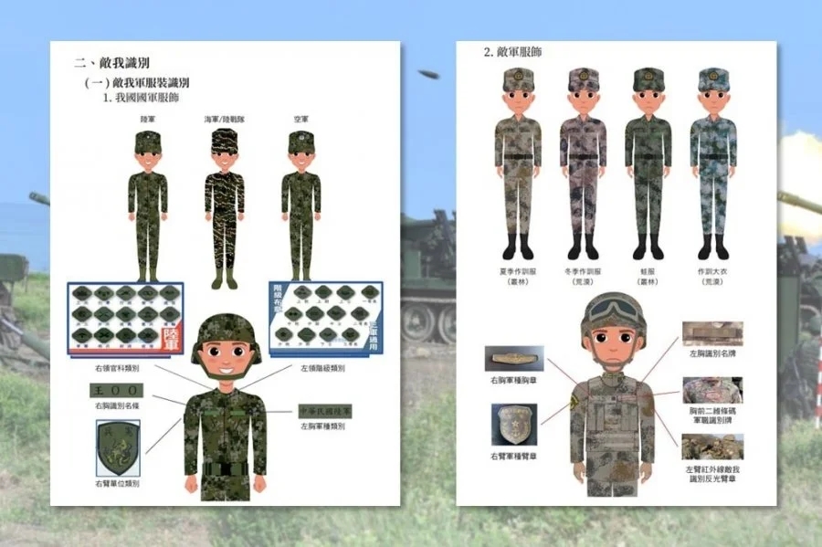 台湾的防务部门去年4月发布“全民国防手册”范本,引发各界对内容的各种批评;参酌各界意见后,台湾防务部门13日正式公布“全民国防应变手册”,提供民众、地方政府紧急应变运用,与去年版本相较,增加“敌我识别”章节,图示4种“敌军服饰”以及服饰上的细节,供民众识别。然而,有脸书军事粉专指出,插图中的解放军迷彩样式全错,且正确的样式其实可在中国国防部官网中找到,痛批“有范例给你抄,还能抄错?”