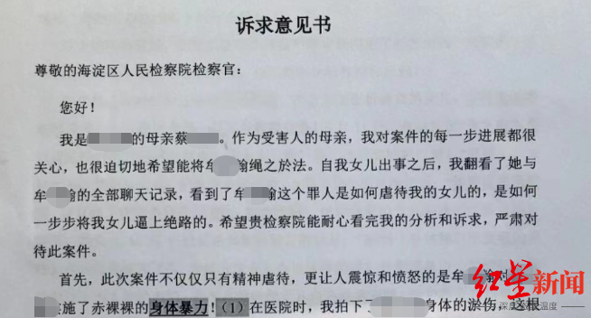 包丽母亲向法院提交的诉求意见书显示,在恢复包丽手机聊天记录后,认为牟林翰对包丽不仅进行精神控制,还疑似打过包丽,并让她做出自扇巴掌、下跪等行为。