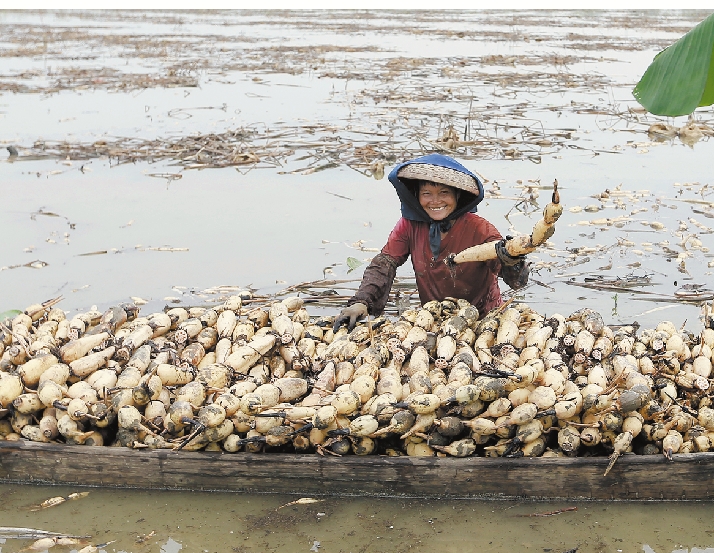 ▲南沙万顷沙,农户在池中采藕。