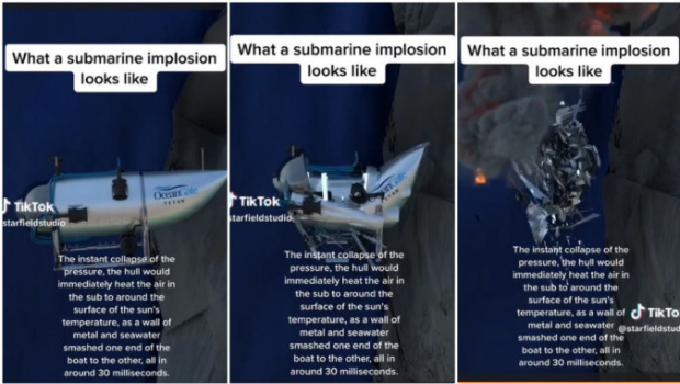 根据Tiktok另外一名用户@starfieldstudio发布的另一段影片,泰坦号正在向海底下沉,接着开始像被踩踏的铁罐一样碎裂,内爆后金属炸裂,未留下一丝痕迹。