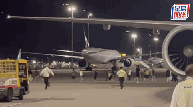 01:35 从社交平台图片所见,一辆打开了逃生梯的客机停在停机坪,大批乘客拿着行李在地面等候。