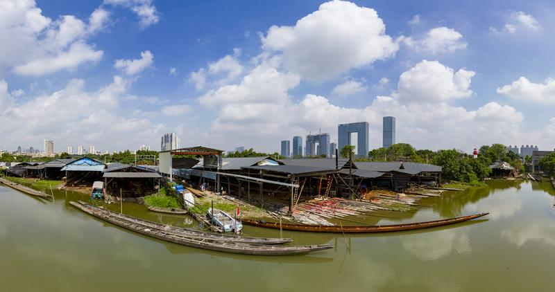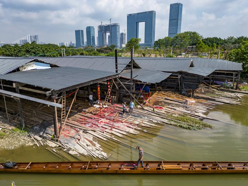 河涌边,绿树掩映,一座座低矮厂房成排矗立;厂房里挥汗如雨,木屑纷飞,工匠们一锤一刀手工雕琢岭南水乡人的图腾——龙舟。