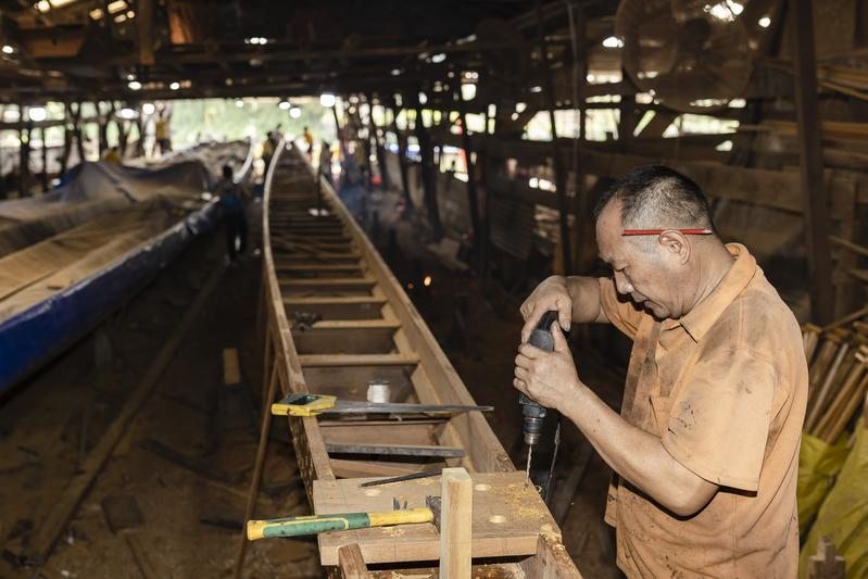 如今,制造龙舟主要使用两种木材,坤甸木和杉木。使用进口的坤甸木做的龙船密度高、质量好、耐用,需要藏在湿泥里隔绝空气保存。而用杉木做的船轻、吃水浅,起步快,平时需要吊挂起来保存。