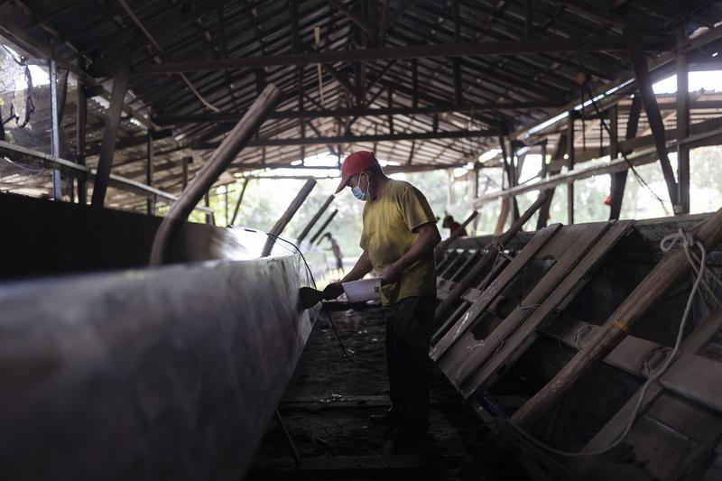 除了本地的订单,还有不少龙船厂接到外省的订单。在记者探访当日,上漖村陈汉慧龙舟基地的工匠正忙着为一艘即将竣工的龙舟修补钉缝。黄褐色木屑覆盖地面,木香弥漫在空气中,几位光着膀子的工匠围着一艘龙舟忙得热火朝天。70岁的曾师傅介绍,“这条龙舟是江西一个村子订的,还有几天就要运走了。”