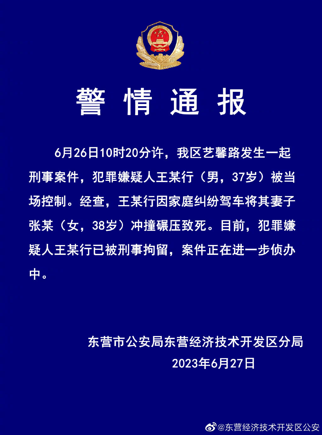 6月27日晚11时19分,东营市公安局东营经济技术开发区分局发布通报,6月26日10时20分许,该区艺馨路发生一宗刑事案件,疑犯王某行(男,37岁)被当场控制。 经查,王某行因家庭纠纷驾车将其妻子张某(女,38岁)冲撞碾压致死。 目前,疑犯王某行已被刑事拘留,案件正在进一步侦办中。