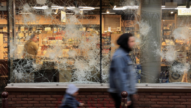 ▲里尔爆发警民冲突,一家店铺的窗被砸至伤痕累累。 路透社