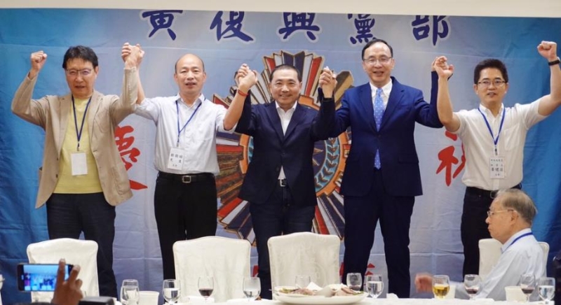 ▲国民党参选人侯友宜(左四)与前高雄市长韩国瑜(左三)1日在国民党黄复兴党部67周年活动中合体,也被视为合作契机。来源:中时新闻网