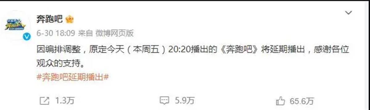 6月30日,《奔跑吧》官微表示,当晚节目延期播出。据悉,在6月23日的节目预告中,蔡徐坤有参与录制(图源:微博截图)