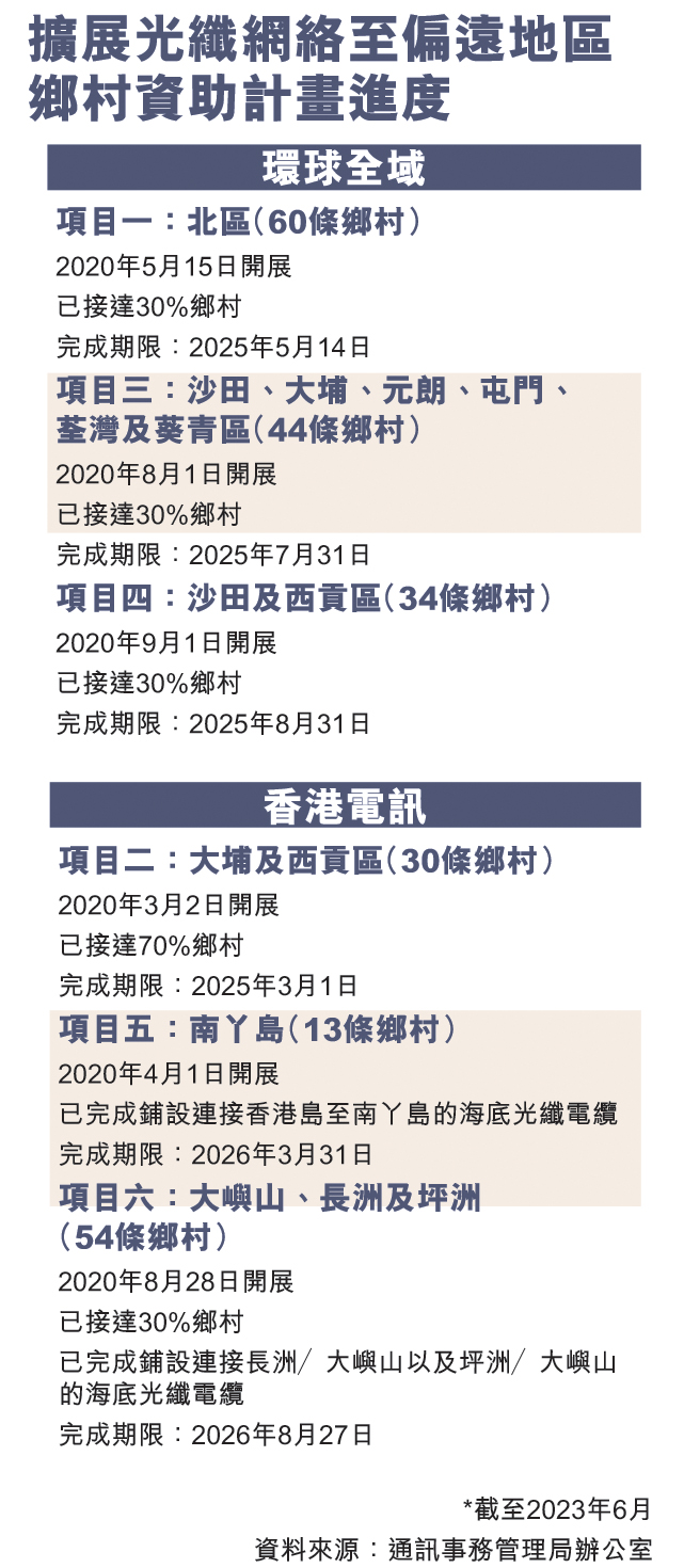 “扩展光纤网络至偏远地区乡村资助计划”针对位于远离固网商现有光纤主干网、仅以铜线网络提供速度只有每秒10兆比特(Mbps)或以下宽带服务的偏远乡村。计划涵盖235条分布于北区、西贡、大埔和沙田等9区内的乡村,预计可惠及11万名村民。涉及的6个投标项目,分别由环球全域电讯有限公司和香港电讯有限公司获选。根据通讯办资料,截至上月,新建的光纤网络已连接共120条乡村(见表),超过整体项目的一半,3条分别连接南丫岛、长洲和坪洲的海底光纤电缆亦已完成。