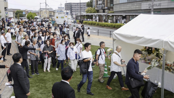 由自民党奈良县党部等人士组成的团体,于周六上午8时30分左右,在安倍遭枪击的近铁大和西大寺站前附近设置献花台,前来悼念的民众将鲜花围着献花台上的安倍遗照