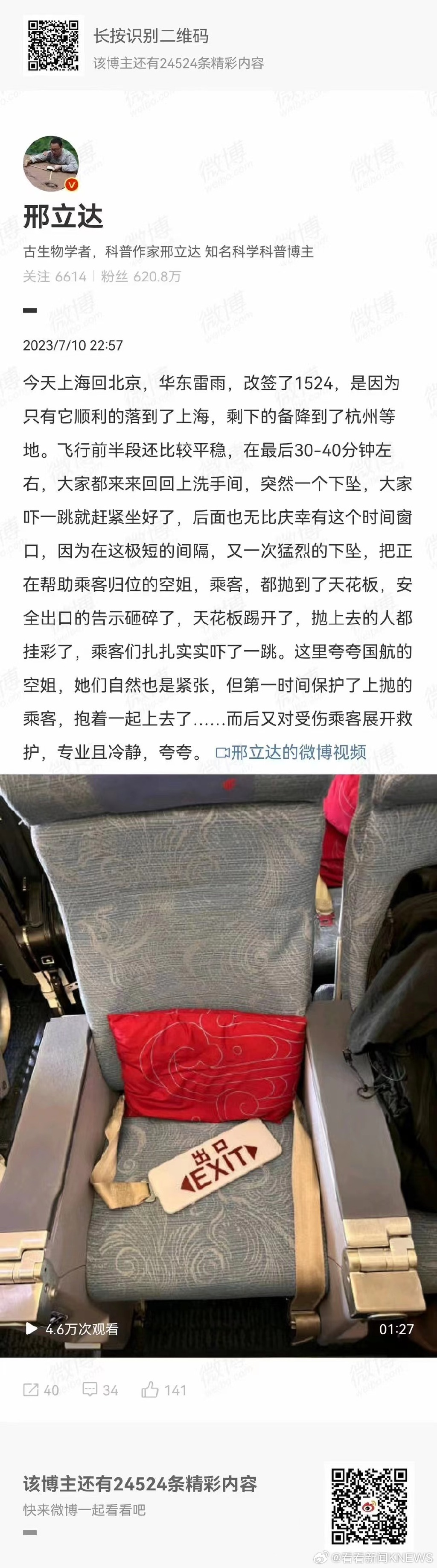 邢立达说,乘客和空中服务员被抛向舱顶就发生在自己座位附近,乘客是一名40岁左右的女性,空姐当时护着乘客,胳膊也流血了,腰也扭伤了。 “天花板顶面被撞得露出了管线,‘出口’标志还掉到了我的脚下。”
