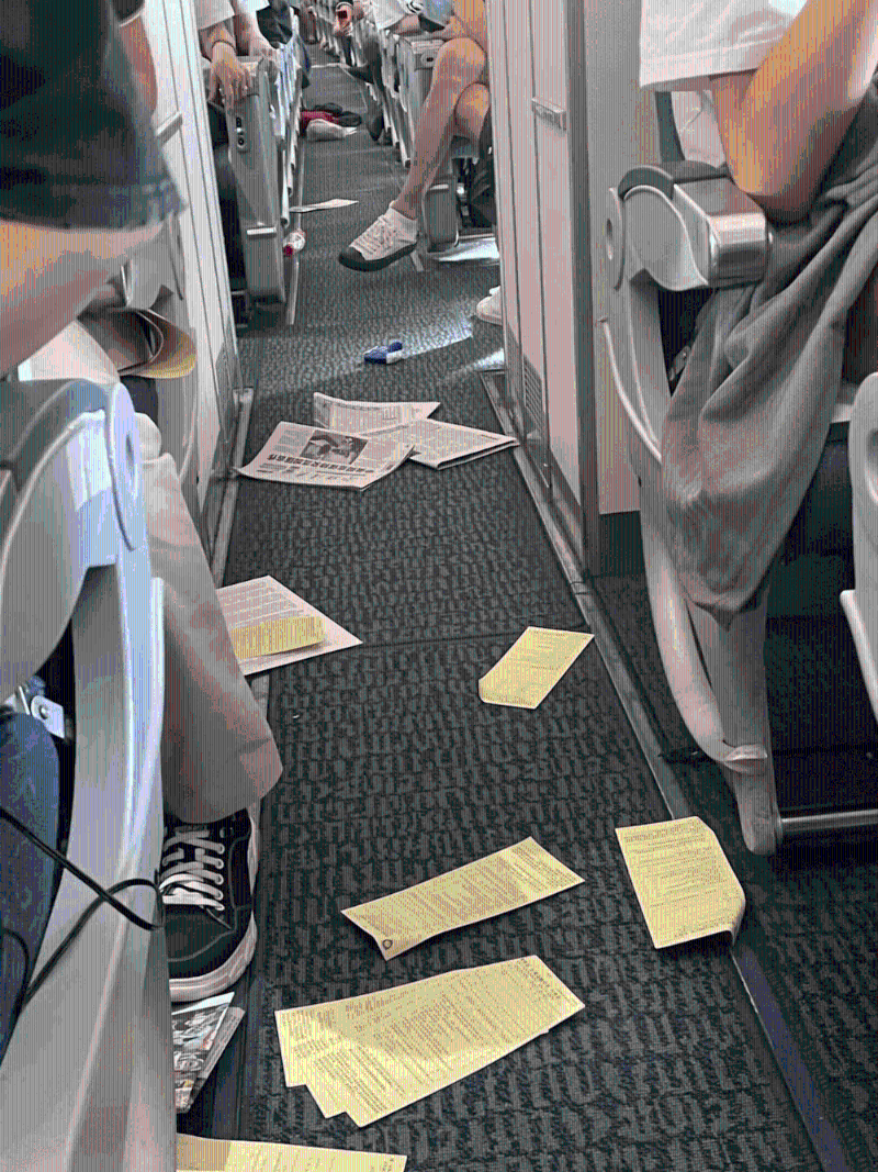 ▲京沪航班遇严重颠簸,事发后满地杂物,一片狼藉。