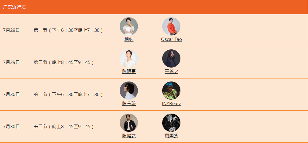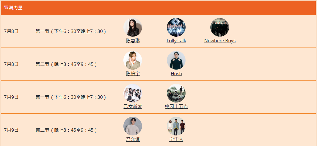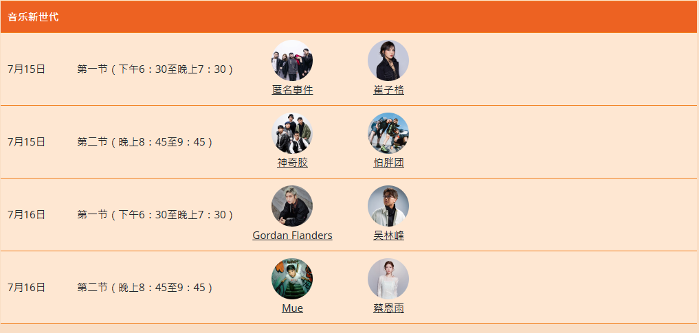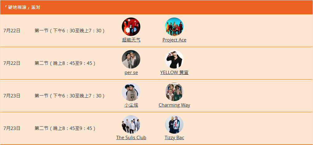 超40组香港、内地、台湾及海外歌手乐队轮流登场,包括本地歌手陈慧琳,冯允谦、王苑之,本地新生代音乐人Tyson Yoshi、吴林峰、Lolly Talk; 内地乐队Project Ace、歌手崔子格; 台湾金曲奖候选歌王“Hush”、创作歌手YELLOW黄宣;泰国新星TYTAN及韩国饶舌歌手 Reddy等。