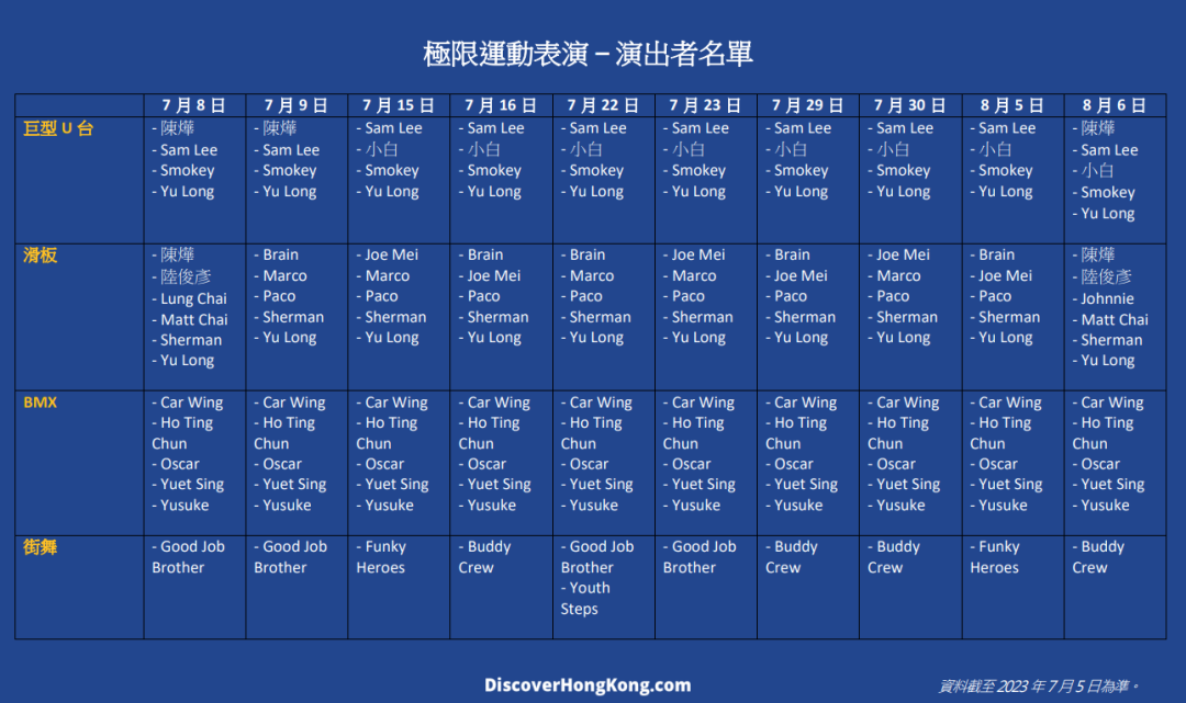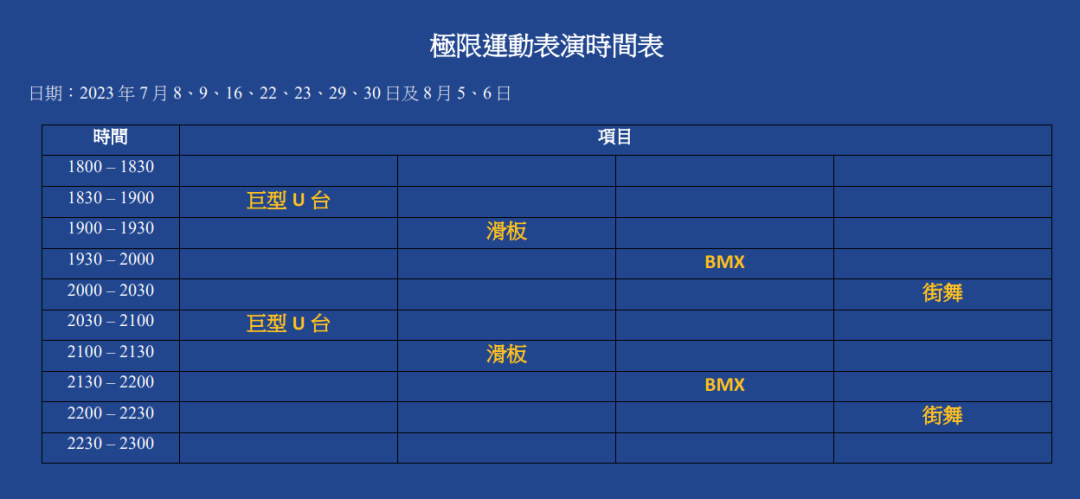 此次嘉年华邀请了诸多极限运动表演者到场表演。以下是极限运动表演时间表: