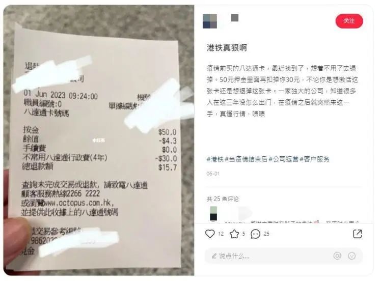 早前就有内地网友在社交平台上发文,指在港铁退回几年没使用的八达通卡,竟然被收取了30港币的行政费,令她大感不满,直接在帖文闹爆:“港铁真狠!”