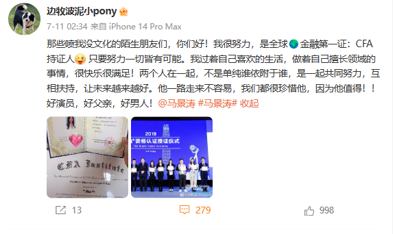 事隔1日,边牧波泥小pony再度PO与马景涛的合照,表示很多朋友都心疼她被网暴,对此,她坚强地表示自己不会去看陌生人不切实际的评论,觉得得到身旁朋友的祝福和支持就足够;接着,她标记马景涛并示爱:“感觉自己很幸运能收获这段感情,因为在现实生活中他真的是一位好男人。人生短短几个秋,珍惜每分每秒去好好爱你爱的人。我爱你,无欲无求,只要你幸福快乐。”截稿前,马景涛尚未做出回应,不知恋情真伪,但他昨点了边牧波泥小pony的贴文赞。