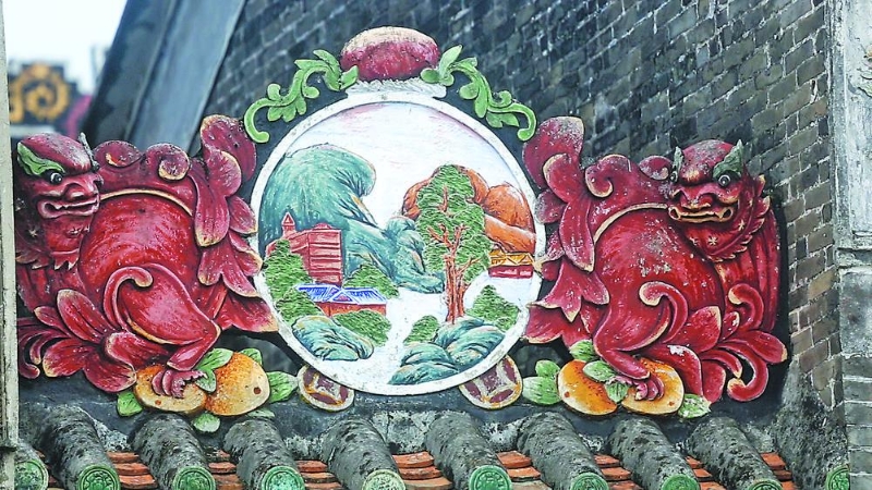 谈起菉猗堂,就不能不说它的蚝墙。当年赵氏族人选用了近百万只硕大的蚝壳,再用黄土与红糖、糯米、醋、谷物等混合而成的黄泥浆,砌成排列整齐的约65厘米厚的墙体。它层层堆砌,不仅具有隔音效果,而且冬暖夏凉、坚固耐用,据说能抵挡枪炮的攻击。蚝壳墙凹凸不平,阳光斜射在墙面上,极具线条感和雕塑感。