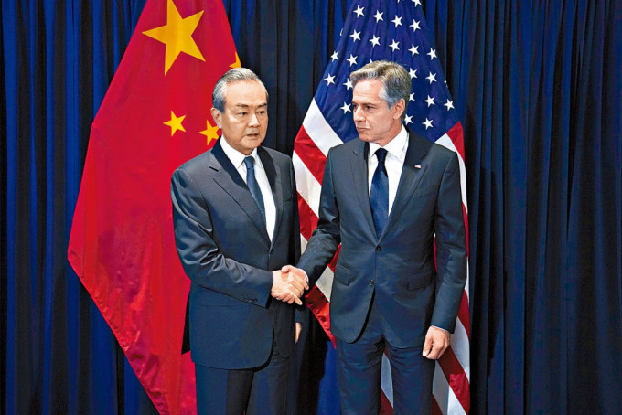 ▲王毅(左)与布林肯(右)昨午在印尼会晤。