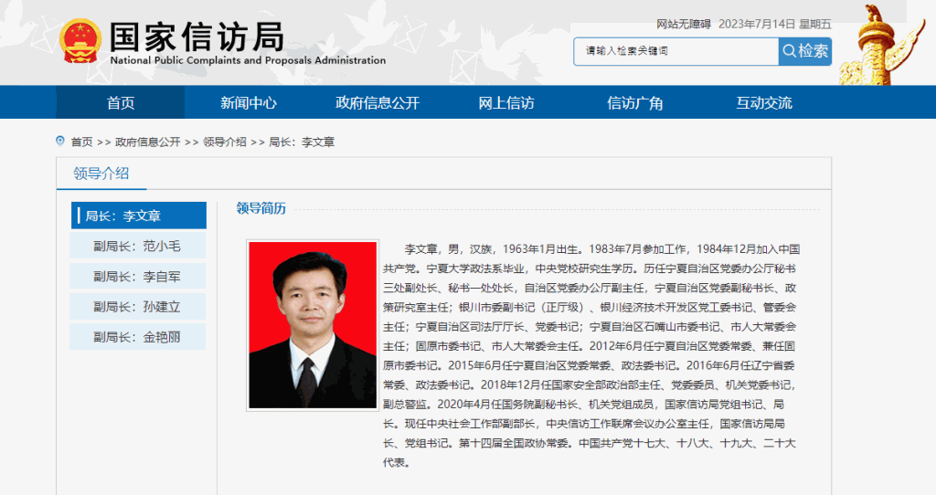 ▲国家信访局网站显示,李文章已调任中央社会工作部副部长。