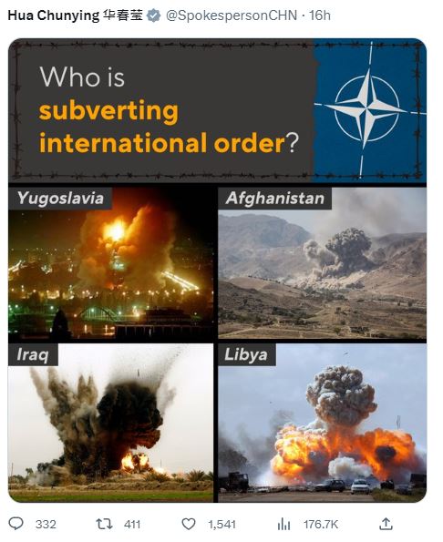 北约峰会正在立陶宛首都维尔纽斯举行,针对峰会期间北约对中国的指责,指中国对欧洲大西洋地区构成“系统性挑战”,并指中国致力于颠覆“基于规则的国际秩序”。北约峰会的联合公报共15次提到中国,2度称中国政策对北约利益、安全和价值观构成挑战,又提到中国核武政策及与俄罗斯关系。对此,中国外交部部长助理、发言人华春莹连发数条推文,对这份北约峰会报告予以严正驳斥。其中,她发布了一张包含南斯拉夫、阿富汗、伊拉克和叙利亚四地被美国及北约炮火轰炸的场景图,并反问道:“是谁在颠覆国际秩序?”