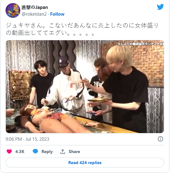 此外,在风波仍持续延烧的期间,Jukiya的频道再度更新一则“女体盛”影片,从画面中可见到一位女性穿着比基尼泳装,躺在长桌上,而身旁有几位男子拿着餐具,纷纷将生鱼片、寿司等食物放在她身上,过程中谈笑声不断,还有人特地将食物放在三点部位,事后也放上完成的特写画面,引发讨论,虽然该则影片已被删除,但社群上仍有不少片段流传。