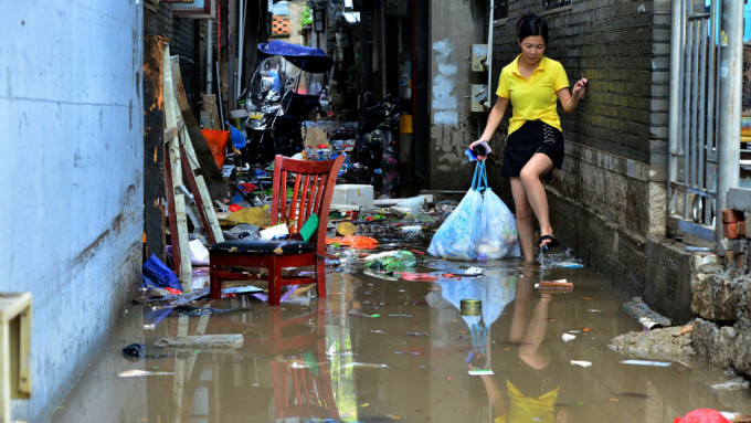 ▲福州市多处水浸马尾区快安村村民涉水出行。中新社