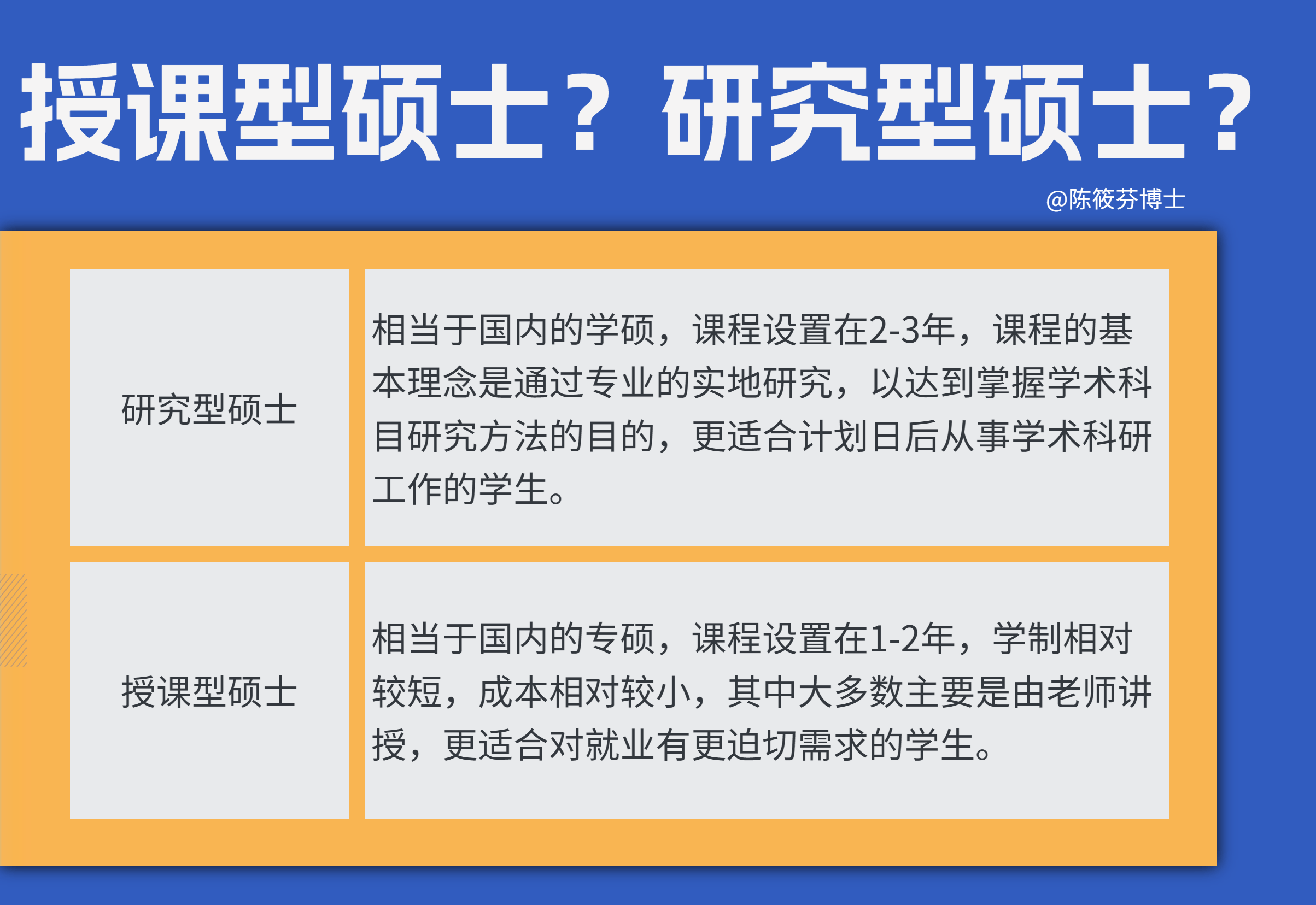 其实授课型硕士只是香港研究生学位中的一种,对应的则是研究型硕士,这是国外的学位名词,用国内的说法,其实就相当于“专硕”和“学硕”。两者在学历水平上是处于同一层次的,只是在培养过程中的目标与侧重点有所不同,进而导致其学制长短不同。