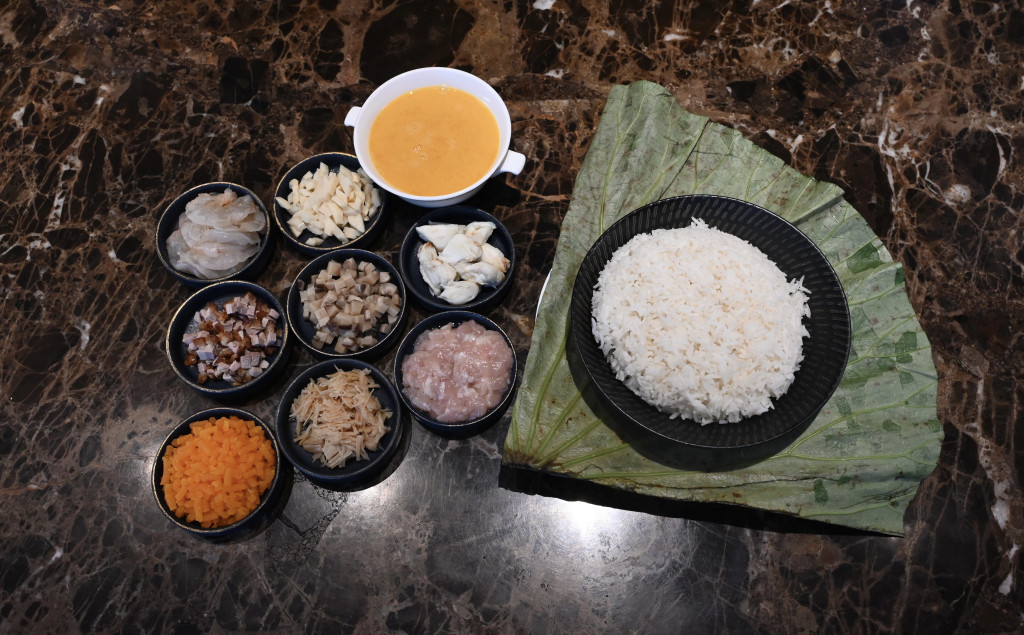 曾师傅解释,荷叶饭结合了用荷叶提香及包裹食物以便携带的民间饮食智慧,随着时代进步,炮制荷叶饭还讲究精挑食材、佐料配搭、调味精准、刀工细致及火候掌控的烹饪技巧。先说白饭,最好严选烟韧有嚼劲的丝苗米,煲煮时水分不宜下太多,炒起来才可颗颗分明、软硬适中。