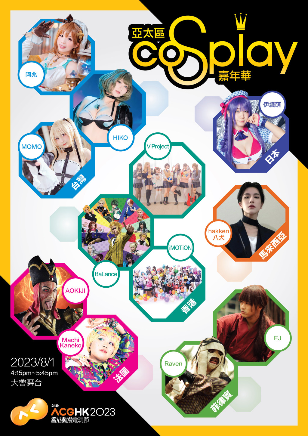 “亚太区Cosplay 嘉年华”将于动漫节最后一日举行,多队亚太区知名Cosplayer组合会参与演出,包括日本伊织萌、马来西亚八犬、法国AOKIJI 及Machi Kaneko、台湾MOMO、HIKO及阿兆、菲律宾 EJ & Raven、香港BaLance、V-Project及iMOTiON都将共聚一堂。