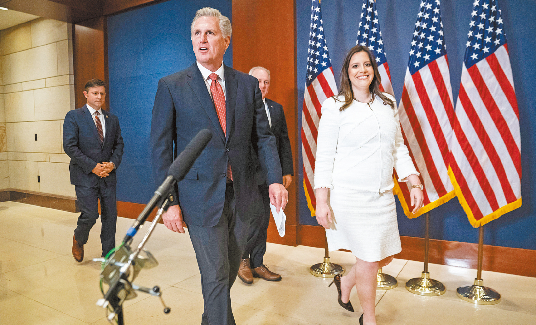 ▲前总统特朗普因涉嫌推翻2020年大选而再度成为调查目标,据知情人士透露,特朗普18日分别与众院议长麦卡锡(左),以及众院共和党第3号人物斯蒂芬尼克(右)通话商议对策。 华盛顿邮报图片