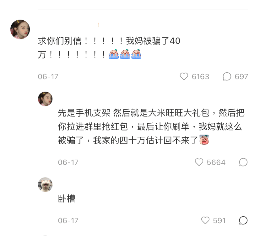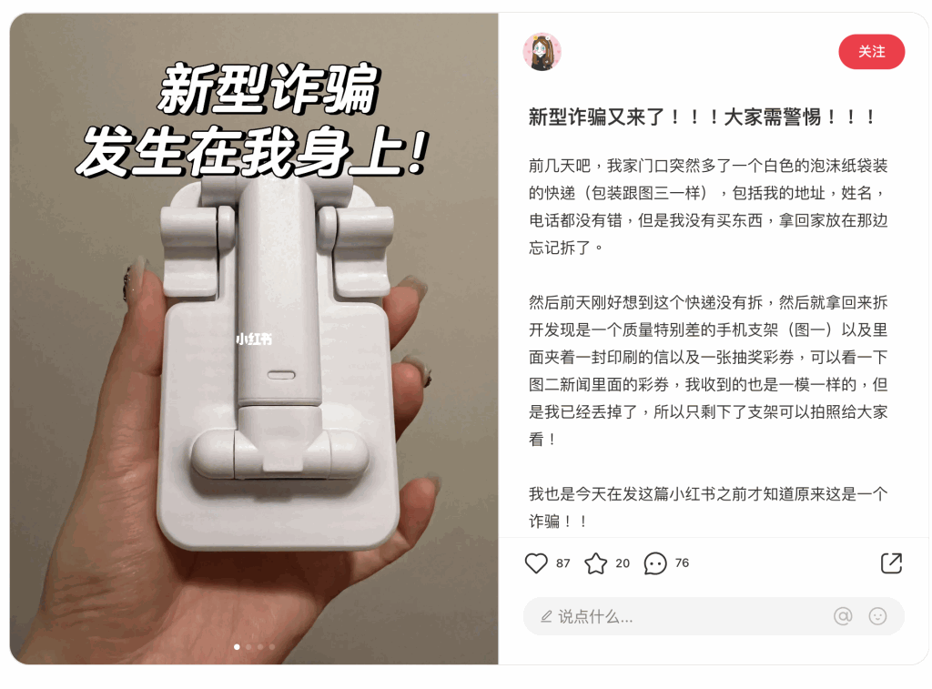 近日有大量网民在内地社交平台“小红书”分享,指自己离奇收到陌生人送来的速递包裹,打开是一份小礼物,有的是手机支架,有的是水瓶水杯,亦有的是纸巾盒,全部都是实用的小物品。 同时包里会有一张刮刮乐抽奖券,刮开后会声称已经中奖,要求中奖者嘟二维码联络领奖。 虽然速递包裹里的小礼物的确是免费,但万一扫了二维码,就有机会被骗,有网民的亲人更因此损失了40万人民币。