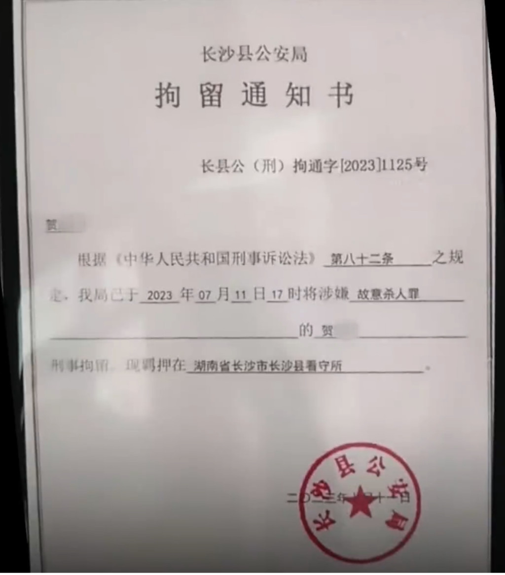 公安局文件显示,贺某某于7月11日因涉嫌故意杀人罪被刑事拘留,被覊押在长沙县看守所。