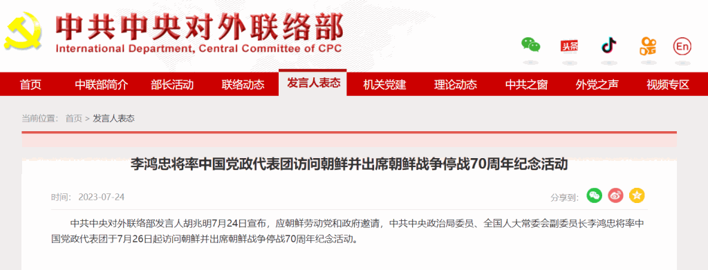 中共中央对外联络部发言人胡兆明当天也宣布,应朝鲜劳动党和政府邀请,中共中央政治局委员、全国人大常委会副委员长李鸿忠将率中国党政代表团于周三(26日)起访问朝鲜,并出席停战70周年纪念活动。