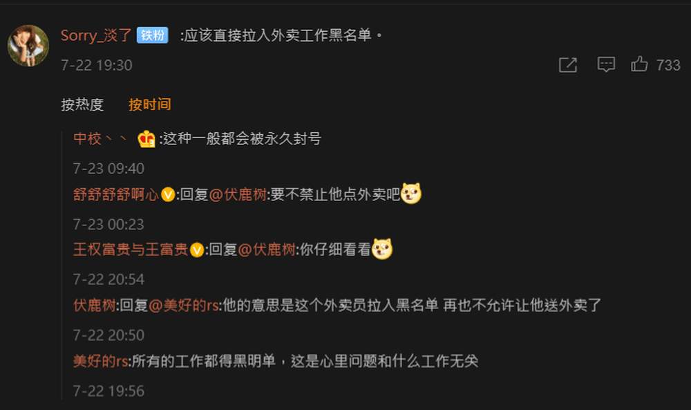 《南方都市报》报道,事发后,涉事配送平台美团得知此事后,第一时间进行订单追查拦截,对用户进行了诚恳致歉及赔偿,顾客并没有食用这份外卖。同时,该平台表示已将该外卖骑手永久拉黑,并同步全行业限制从业。另外,据该配送平台透露,报警后,警方立即展开调查处置,目前该外卖骑手已被警方行政拘留。