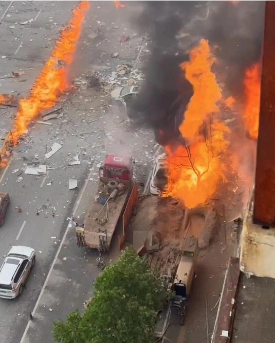 一段行车记录仪记录下的网传影片显示,今(29日)早上10时11分,从街道右侧的地面突然衝出一团火焰,瞬间火势扩散黑烟滚滚。另一段航拍影片显示,行车道中央护栏处起火,火焰目测几十米以上,大大小小的玻璃瓦砾遍地都是,波及停在路边的车辆损毁严重。