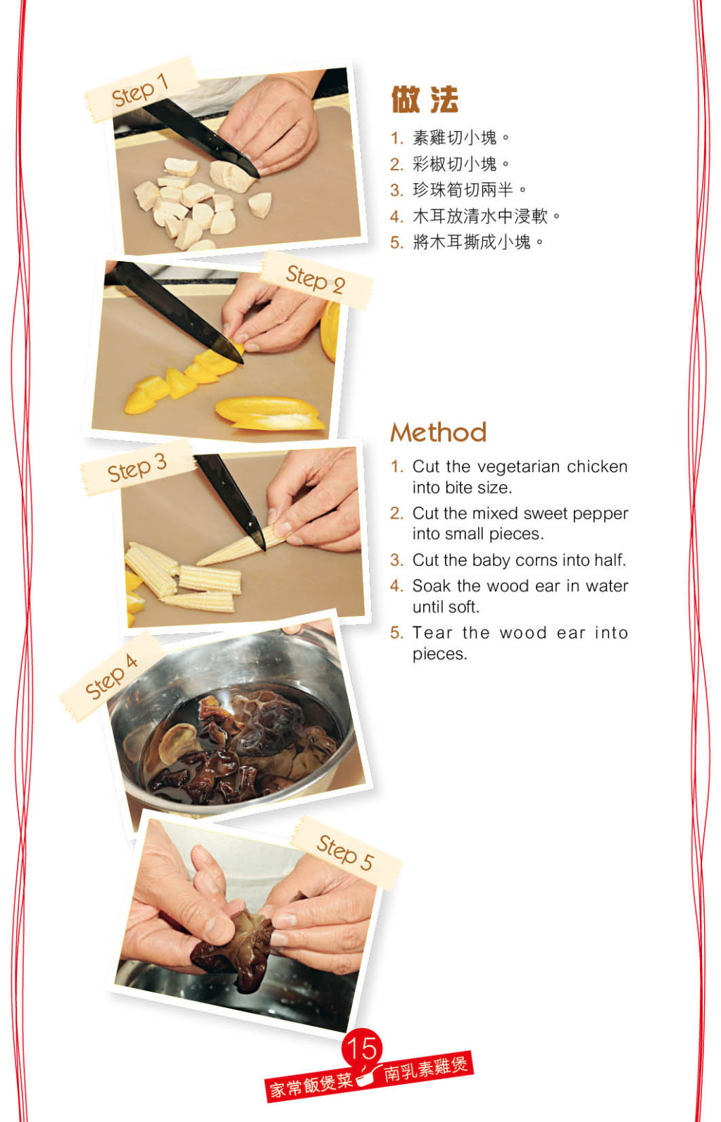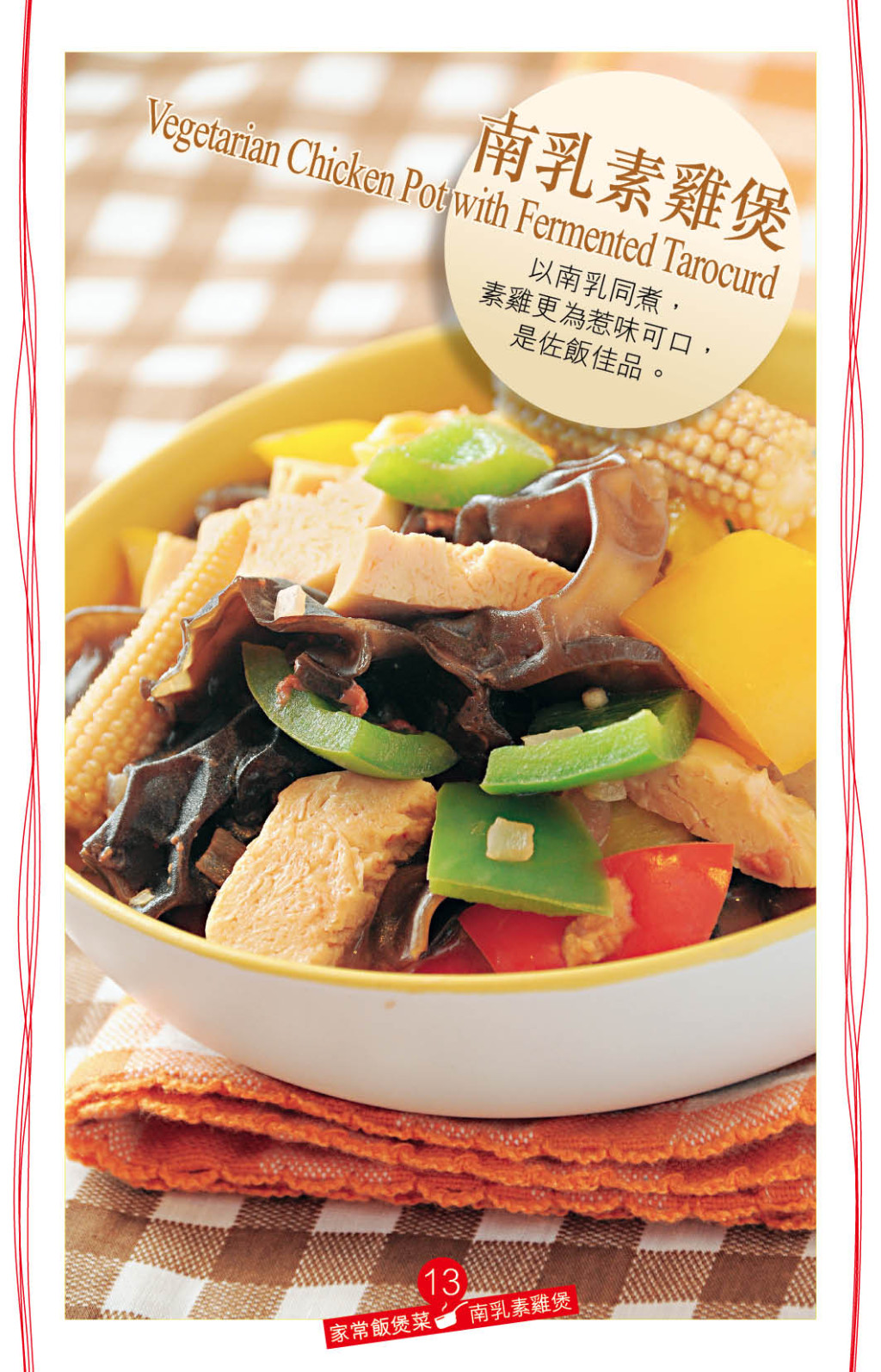传统中式素菜多用南乳作调味,用电饭煲烹调这道“南乳素鸡煲”,同样惹味香浓,秘诀是先爆香南乳,再加入蔬菜炒匀及下调味料煮熟即可,另外糖是必备调味料,可以中和南乳咸味及提升鲜香。