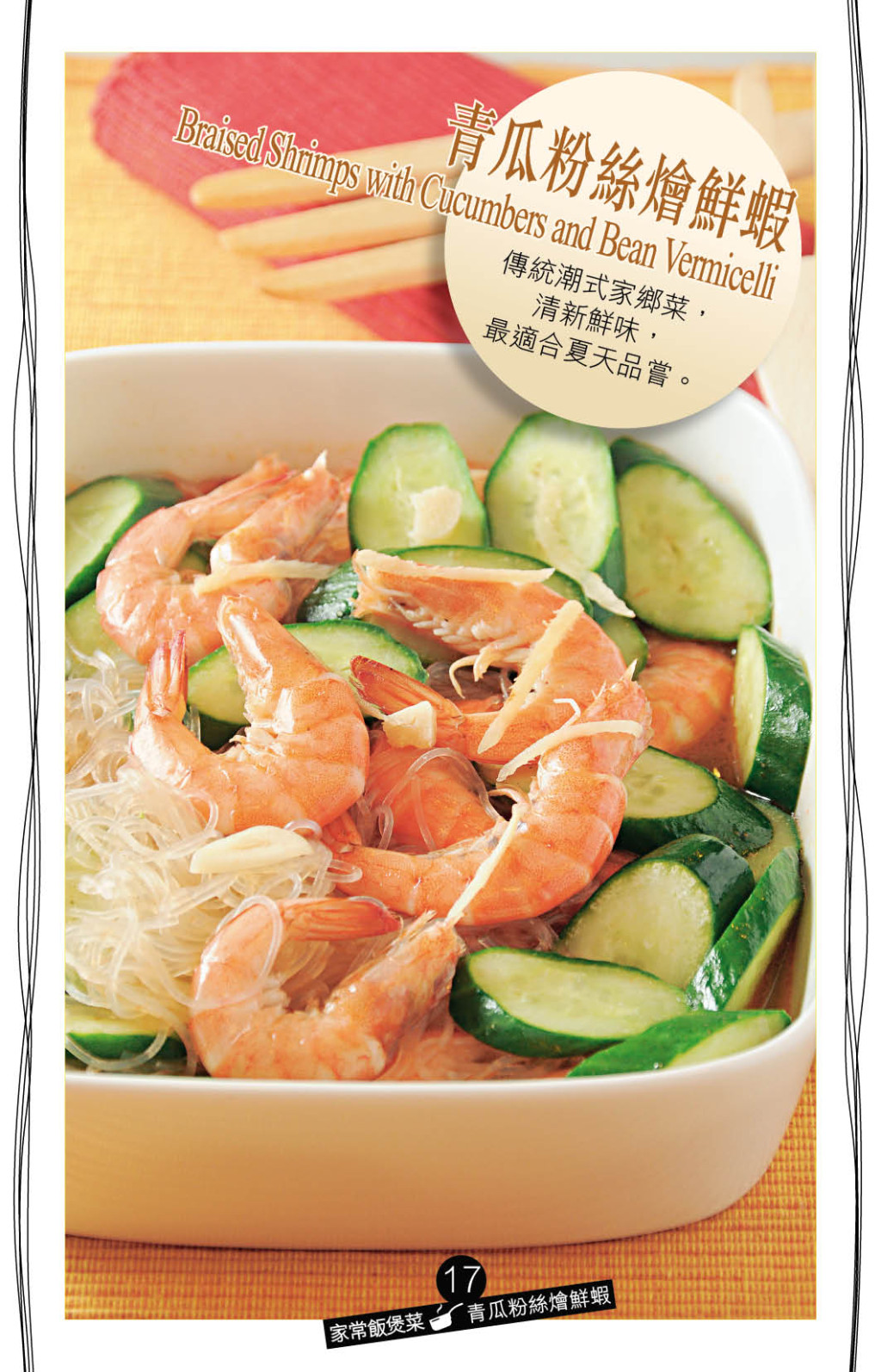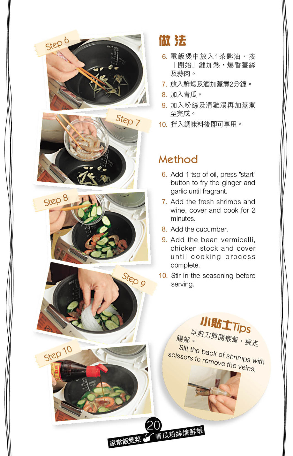 用电饭煲煮“青瓜粉丝烩鲜虾”,选游水海虾或冰鲜虾均可,质感同样爽脆,加入姜片及绍兴酒可去除虾腥味,粉丝吸了虾鲜味及调味料的香气,十分美味。