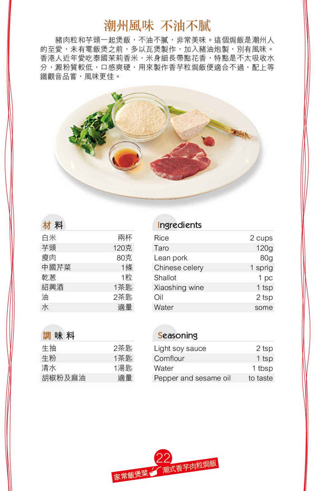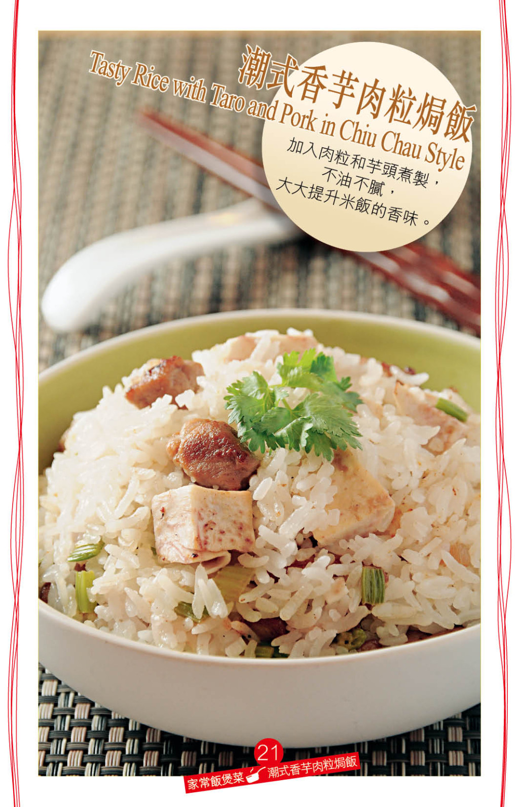 用电饭煲做焗饭及焖饭,比用明火更容易。 “潮式香芋肉粒焗饭”啖啖芋头和芹菜香气,想令香味更丰富具层次,建议再加入爆香的冬菇粒和虾米,并多花一点工夫,先炸芋头至金黄才加入米饭中煲煮。