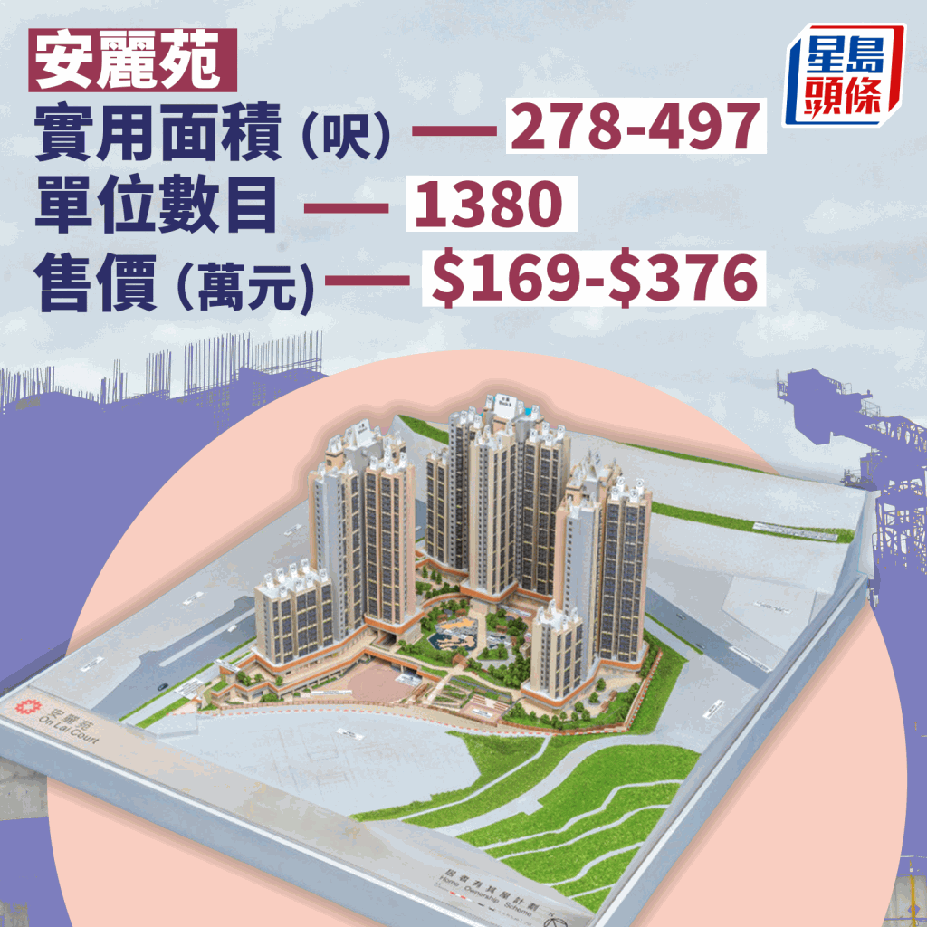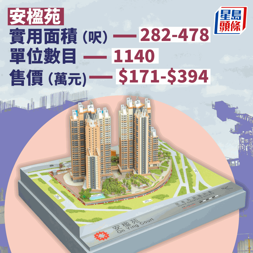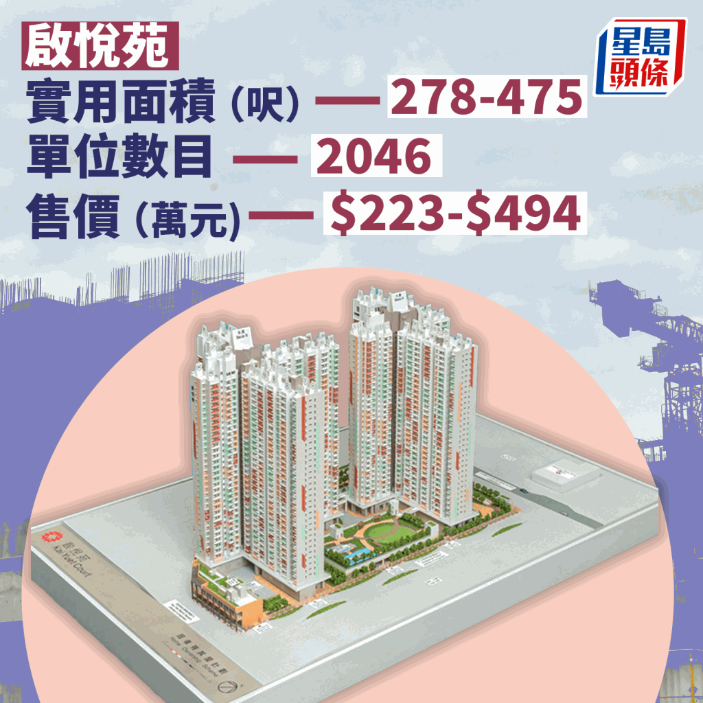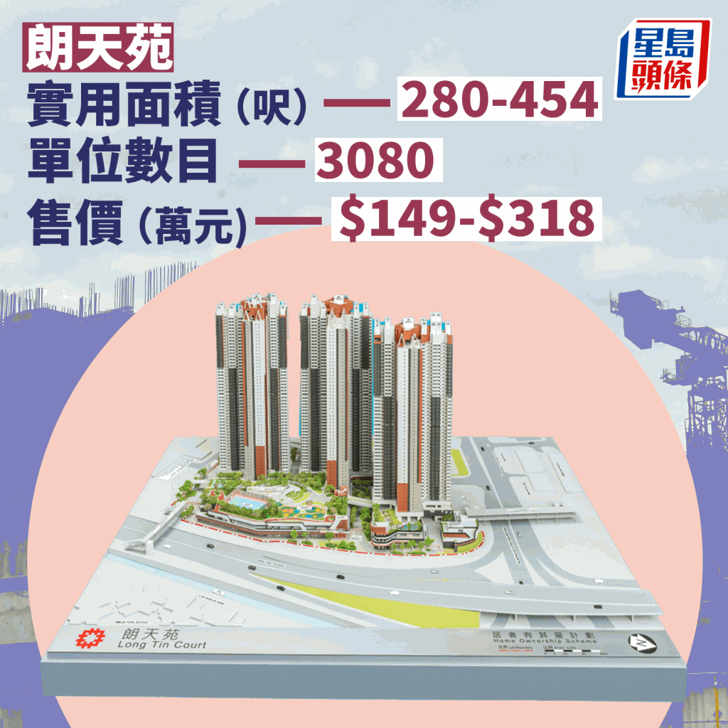 六个新建居屋发展项目共9,154个单位,包括启德启悦苑; 观塘安楹苑、安丽苑和安桦苑; 屯门兆翠苑; 以及元朗朗天苑。
