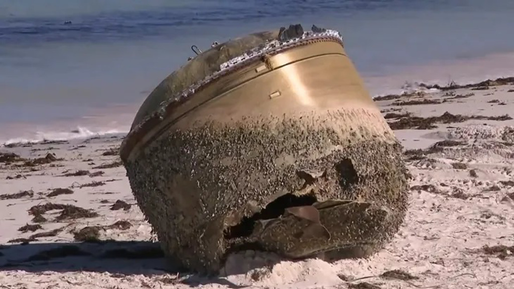 这个表面附着甲壳类动物的大型圆柱体,7月中旬在西澳州首府伯斯(Perth)以北车程2小时的偏远海岸地区朱里恩湾(Jurien Bay)附近被人发现,。