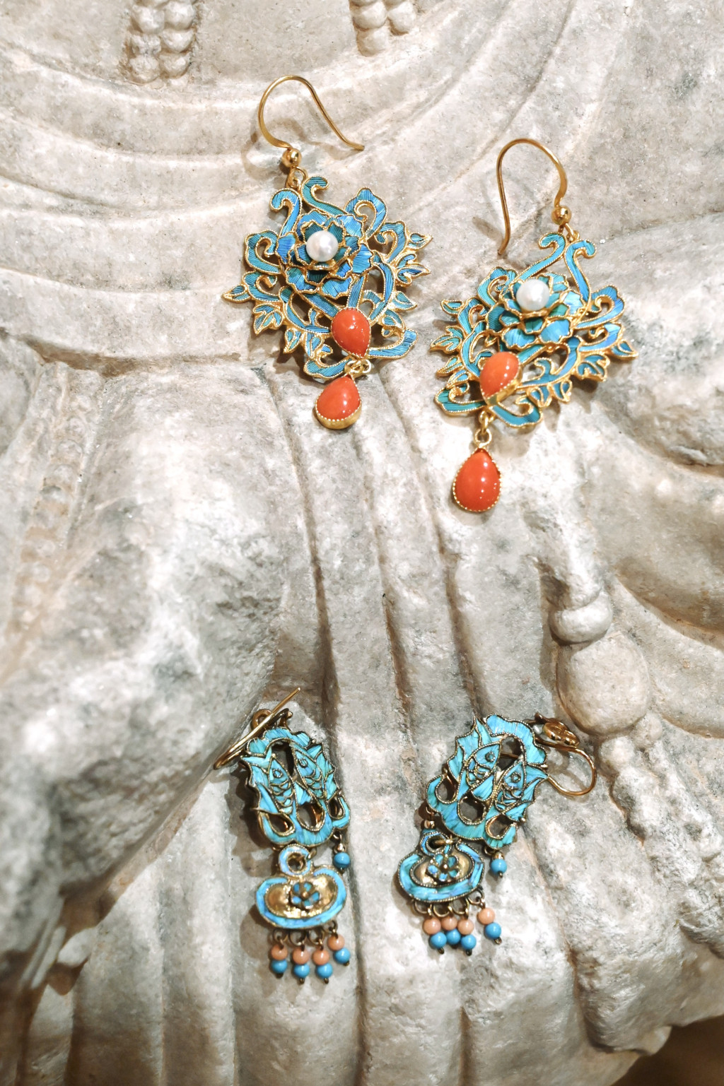 ▲这两款点翠耳环,乃由Loretta从日本一家古董店买回来的点翠冠冕拆下来再重新设计的,加入珍珠及珊瑚,拼凑出夺目视效。