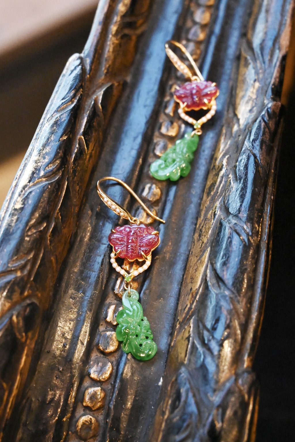 ▲Loretta将两枚小巧的古玉翡翠,重新配以黄金、钻石及碧玺,设计出这对别致的耳环。