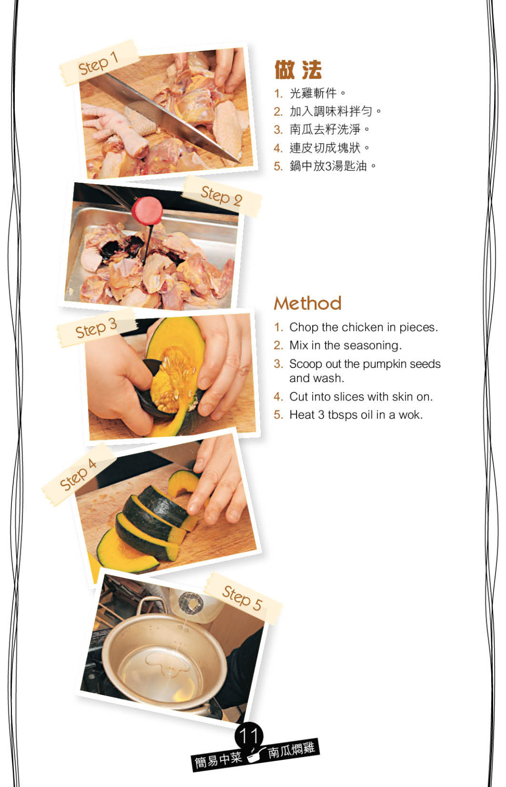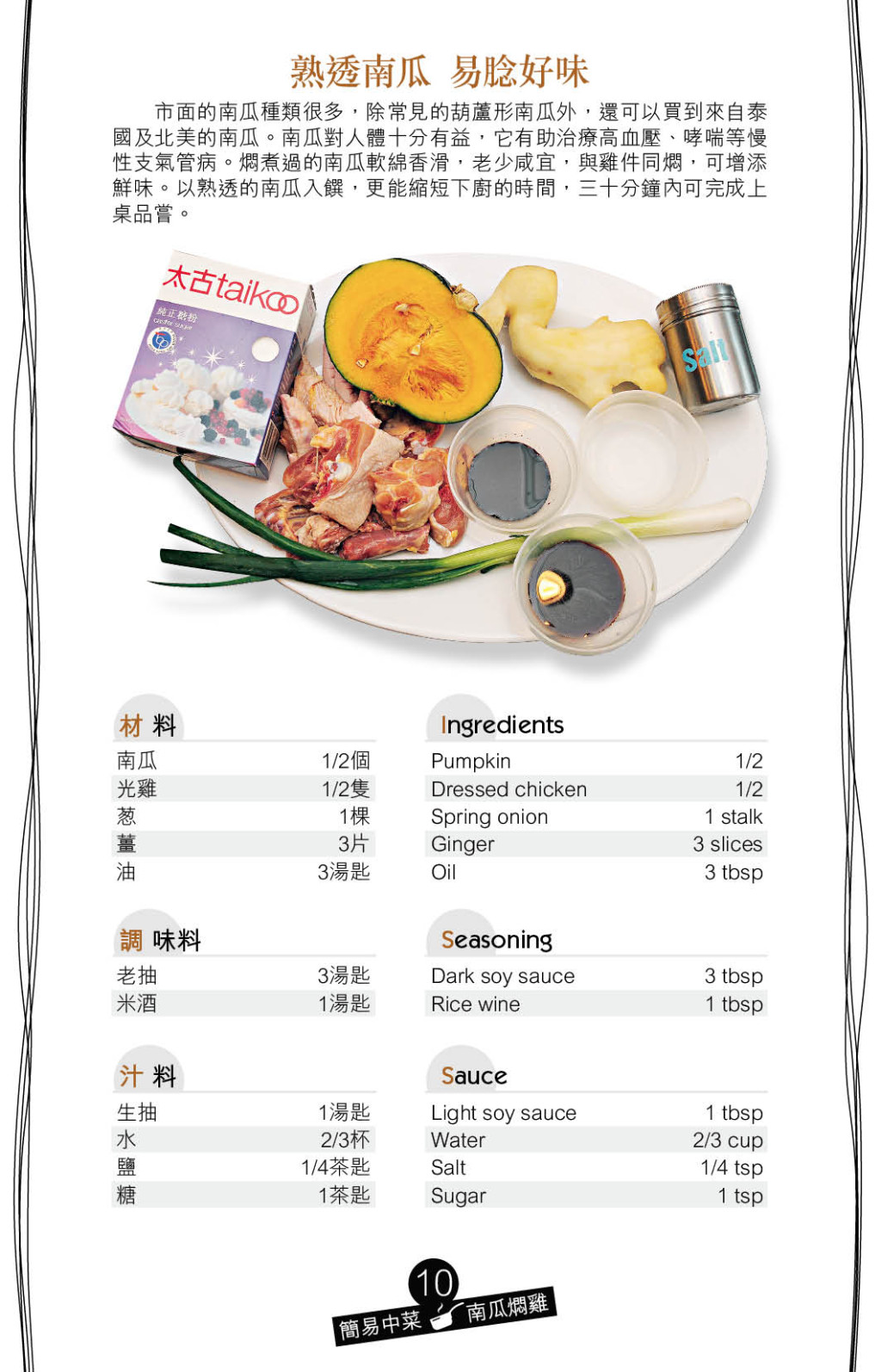 生南瓜质感结实,但容易煮腍,不用费时烹调。南瓜很适合配搭肉类入馔,清甜南瓜香可为肉类增添香甜味道。喜欢吃鸡,必试“南瓜焖鸡”,用姜和葱爆香鸡件及南瓜,灒酒提升香气,配搭简单调味料,焖煮至鸡肉入味及南瓜软腍便可上碟。