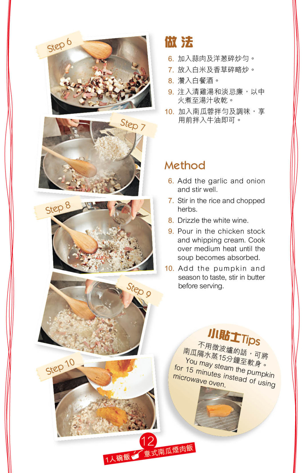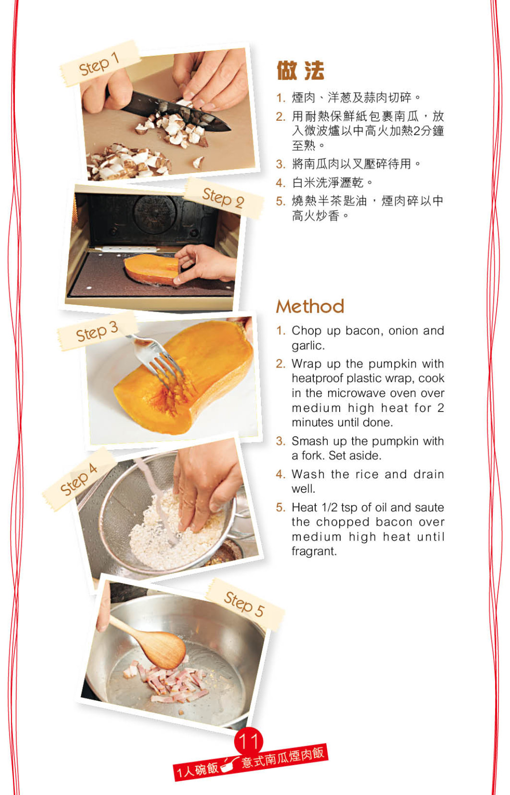 南瓜饭是常见有营美食,今日教煮的“意式南瓜烟肉饭”,改用白米取代意大利米,口感更清爽,先用微波炉加热南瓜做成蓉,配料沿用意式风味,加入白酒、淡忌廉、烟肉、香草、牛油及清鸡汤,最后味道丰富。