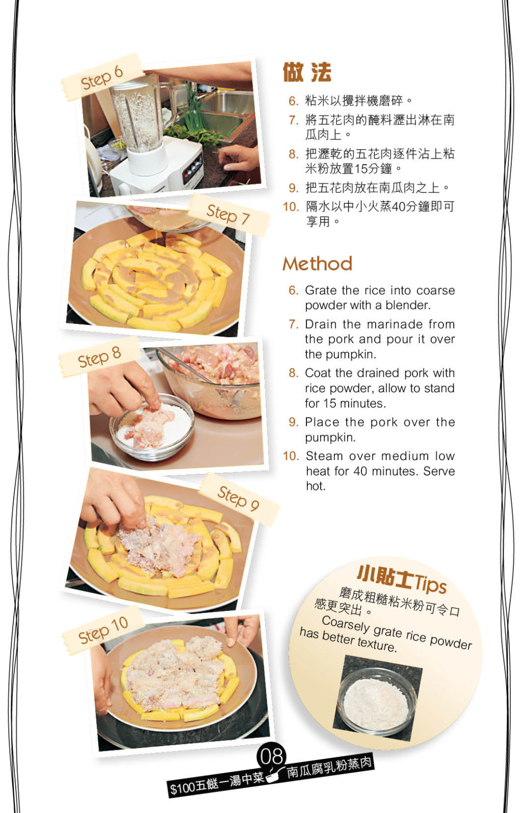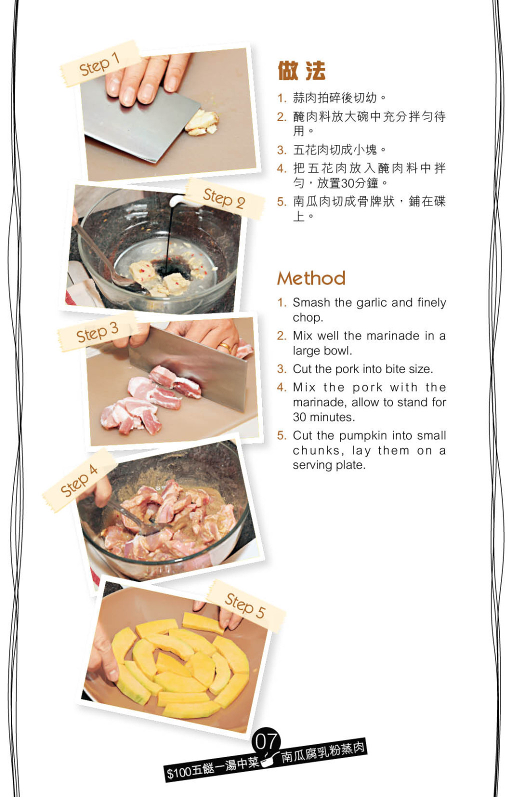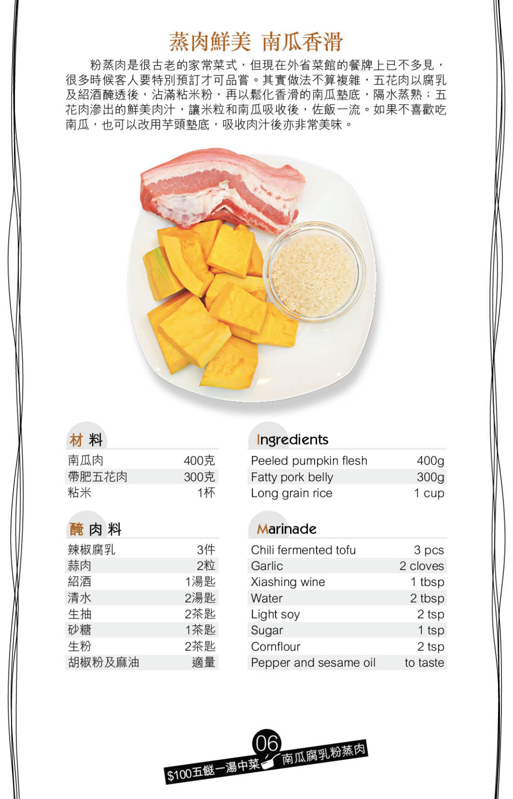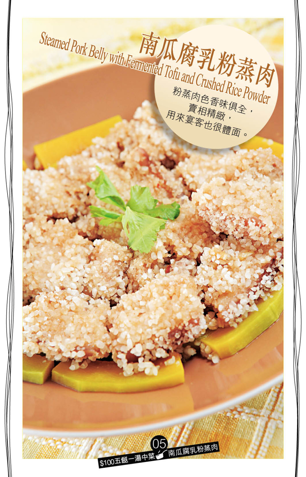 看似烹法复杂的“南瓜腐乳粉蒸肉”,其实也可轻易做到。用腐乳及绍酒腌透五花肉,以搅拌机磨碎粘米,将腌好的五花肉沾满粘米,在碟上铺上南瓜片垫底,放上五花肉蒸熟,南瓜吸收了肉汁,特别惹味。